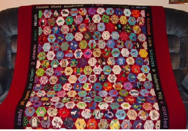 Some of the red blocks with red points are easiest to see. On this first hexagon quilt, look closely at the inner border, some of the I Spy items are named.