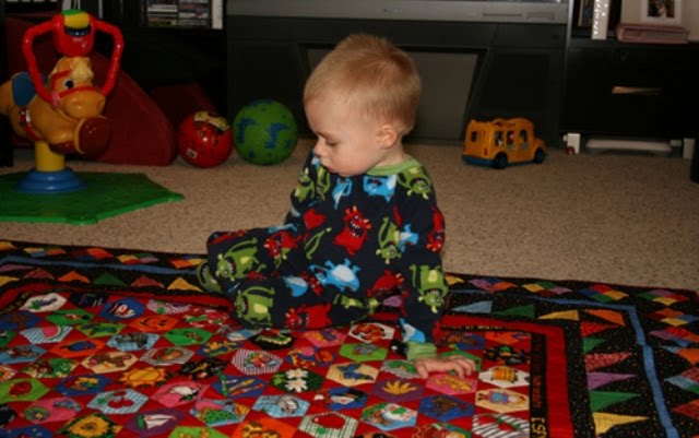 This little guy's PJ's makes him dissappear right into his quilt, wouldn't you say? What's good to note in this quilt, is the exquisite pieced borders and how they play right into the colors of the middle of the quilt.