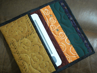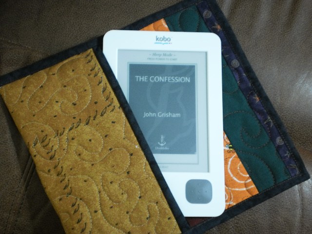 You might have expected this.   Today, hubby drove me to the store and took his Kobo to read in the car while I was in the store.  We realized that we needed a carrying case.   So, when we got home, I whipped this little case.    See,  I had made a case last year for a friend (hi Jill) and used the Moda Bakeshop Bookkeeper pattern.   I really liked using the fun red colors and the chance to use the nice fancy stitches on my sewing machine.